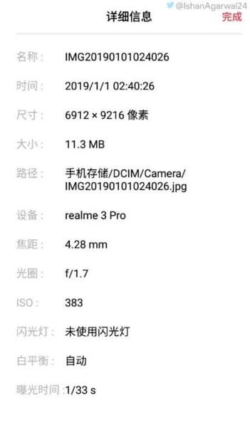 А теперь, пожалуй, самое интересное: сетевой информатор Ишан Агарвал (Ishan Agarwal) опубликовал на своей странице в Twitter снимок, сделанный камерой Realme 3 Pro, с данными EXIF. Как оказалось, с основным датчиком изображения соединен объектив с максимальной диафрагмой F/1,7, а разрешение готового снимка составило почти 64 Мп!