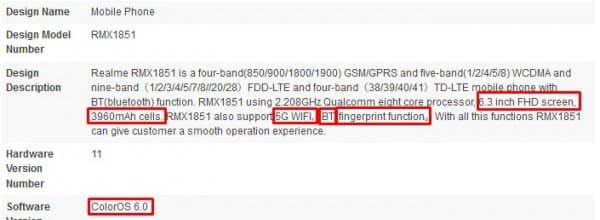 Позже смартфон с тем же обозначением RMX1851 обнаружился в базе данных отраслевой группы Bluetooth SIG. Из краткого описания модели следует, что она оснащена экраном диагональю 6,3 дюйма разрешением Full HD+, сканером отпечатков пальцев, адаптерами Bluetooth 5.0 и двухдиапазонным Wi-Fi, аккумулятором емкостью 3960 мА·ч. Наличие интерфейсной надстройки Color OS 6.0, опять же, указывает на Android 9.0.