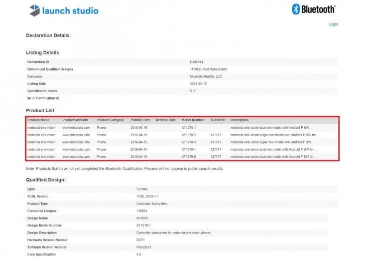 Наряду с Razr 2019 сертификацию Bluetooth получила модель Motorola One Vision. Она будет выпускаться в четырех вариантах.
