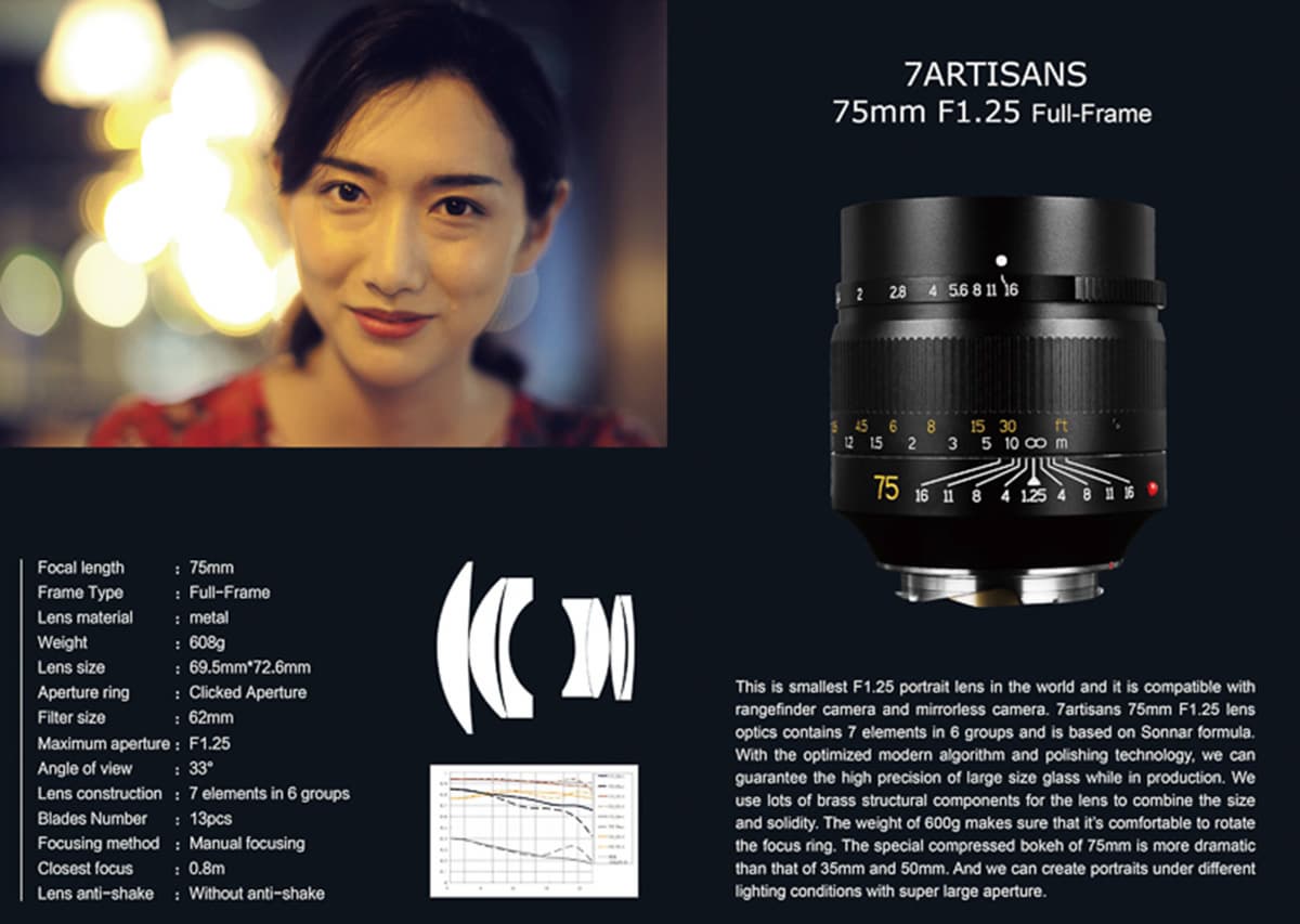 Источник опубликовал новые изображения и полные спецификации объектива 7Artisans 75mm f/1.25 с креплением Leica M, первые изображения которого появились на днях.