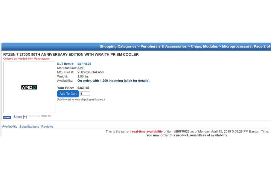 В этом году компания AMD празднует свое 50-летие. Юбилей будет отмечен, в частности, специальной версией восьмиъядерного настольного процессора Ryzen 7 2700X. Он имеет каталожный номер YD270XBGAFA50. Американский интернет-магазин ShopBLT выставил процессор на продажу по цене 340,95 долларов, но очень скоро добавил на страницу пометку «нет в наличии».