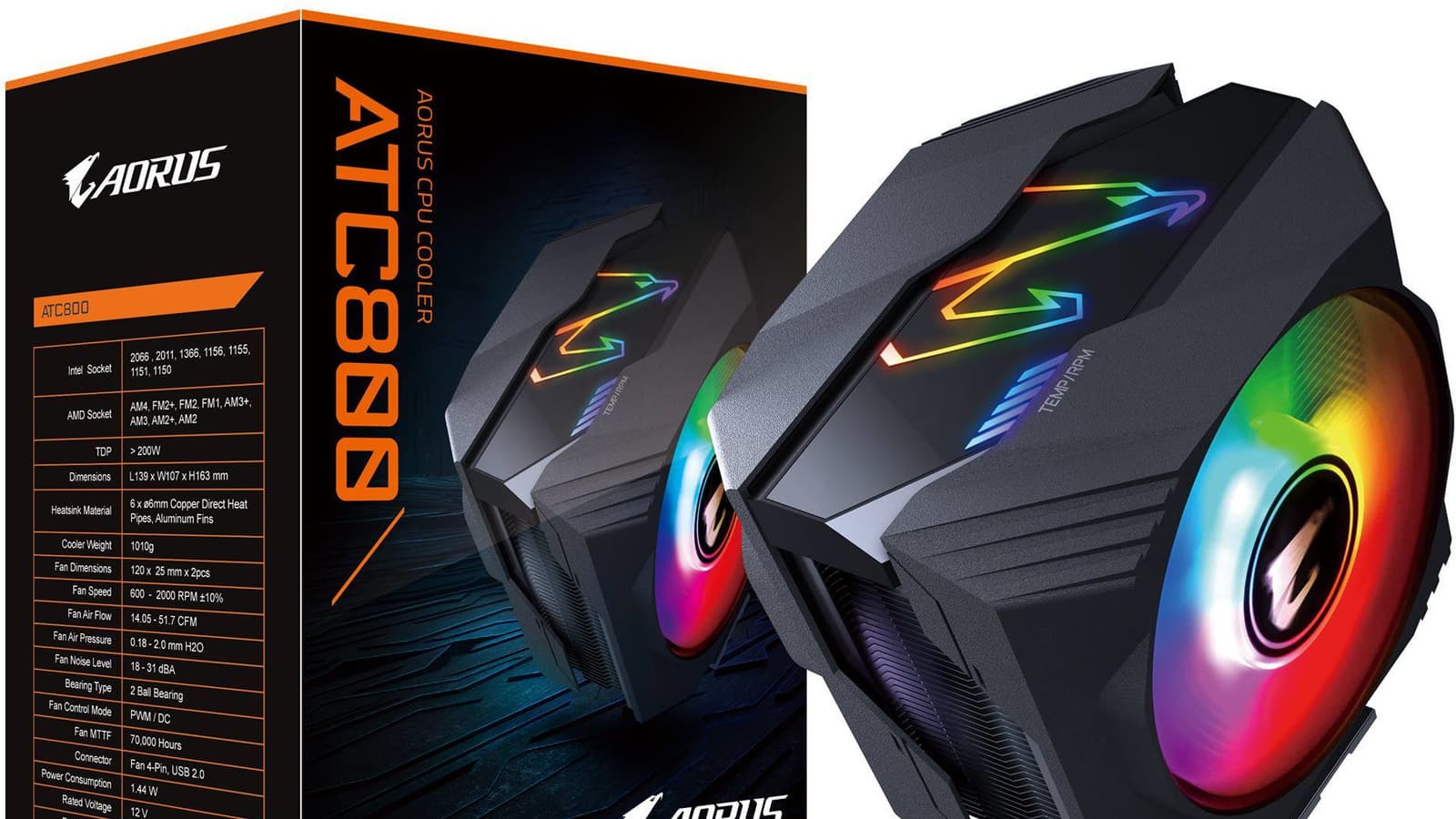 Компания Gigabyte представила воздушную процессорную систему охлаждения Aorus ATC800. Она выполнена по классической схеме: теплоотводящее основание шестью тепловыми трубками диаметром 6 мм связано с «башней» из алюминиевых ребер. На радиаторе с двух сторон закреплены вентиляторы. Они и верхняя сторона радиатора прикрыты пластиковыми кожухами.