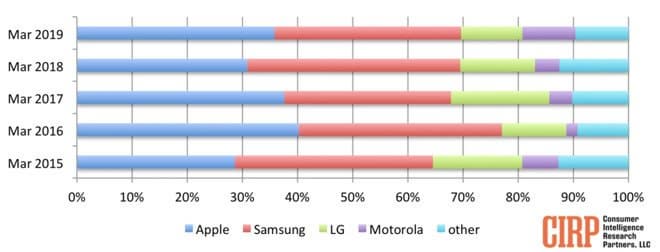 Если верить статистике, доля Apple составляет 36%, а доля Samsung — 34%. Эти две компании опережают конкурентов с большим отрывом. Находящиеся на третьем и четвертом местах компании LG и Motorola имеют доли 11% и 10% соответственно.