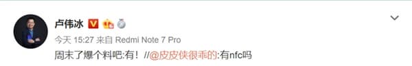 Данные получены, можно сказать, от первоисточника – главы бренда Redmi Лю Вейбинга (Lu Weibing). Один из пользователей соцсети Weibo напрямую спросил у топ-менеджера, будет ли перспективный флагман Redmi поддерживать NFC, и тот ответил утвердительно.