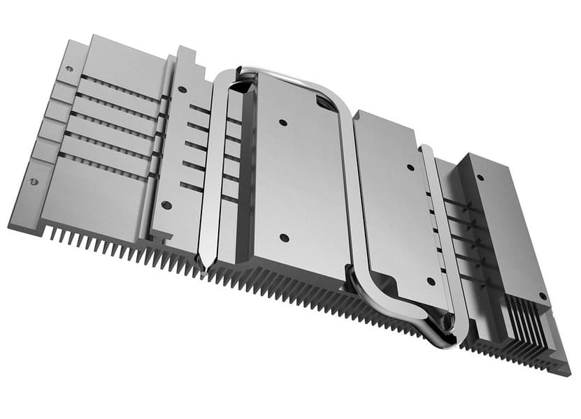 Конструкция системы охлаждения включает тепловую трубку, непосредственно контактирующую с GPU. Кроме того, радиатор имеет выступ, который контактирует с мощными элементами в цепях питания. На радиаторе установлено два 90-миллиметровызх вентилятора.