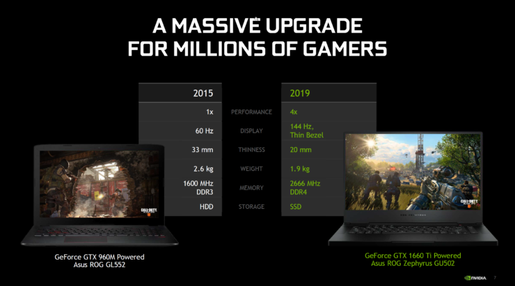 Компания Nvidia сегодня не только представила видеокарту GeForce GTX 1650 для настольных ПК, но и анонсировала мобильные варианты GeForce GTX 1660 Ti и GeForce GTX 1650. Эти модели предназначены для массовых игровых ноутбуков: ценой от $800 в моделях с GeForce GTX 1650 и ценой от $1000 в моделях с GeForce GTX 1660 Ti.