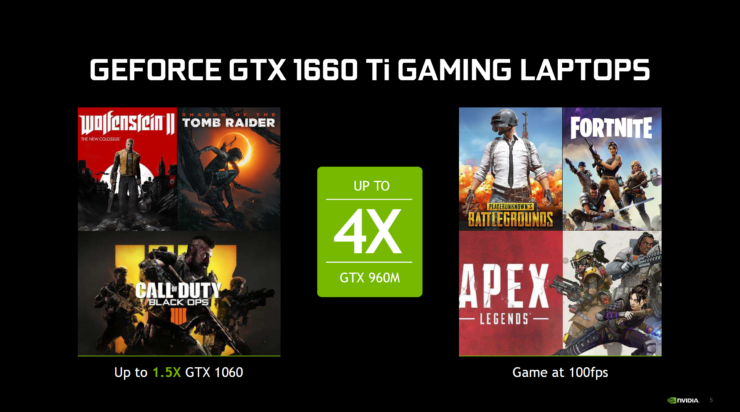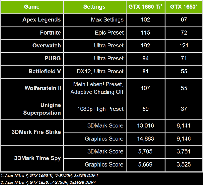При описании моделей Nvidia указывает на их высокую производительность относительно предшественников. Так, GeForce GTX 1660 Ti в 4 раза быстрее GeForce GTX 960M и в 1,5 раза быстрее GeForce GTX 1060, а GeForce GTX 1650 в 2,5 раза превосходит GeForce GTX 950M и в 1,7 раза — GeForce GTX 1050. При разрешении Full HD GeForce GTX 1660 Ti обеспечивает кадровую частоту свыше 100 FPS в большинстве современных игр, в числе которых PUBG, APEX Legends, Overwatch и Fortnite. GeForce GTX 1650, в свою очередь, обеспечивает свыше 60 FPS.