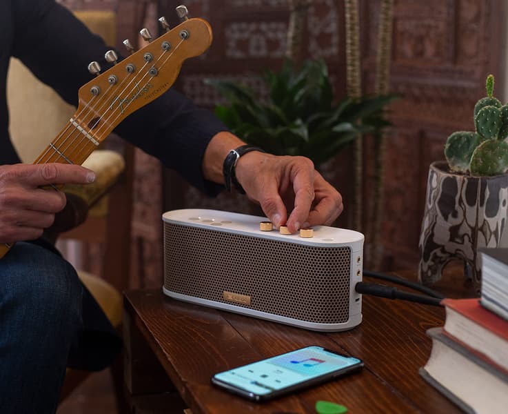 Собственно, от других мобильных колонок Roland BTM-1 отличается наличием входа для подключения электрогитары. По мнению производителя, BTM-1 — это удобный способ бороться с ежедневным стрессом путем игры на гитаре в любых условиях. В усилителе есть эффекты «перегруза» и реверберации, а также регулировка тембра. Мощность колонки – 2 х 4 Вт.