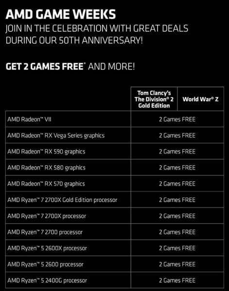 Отметим, что две бесплатные игры могут также получить покупатели всех моделей процессоров серии Ryzen 2000 для настольных компьютеров и некоторых моделей 3D-карт серии Radeon. Наличие игр в комплекте поставки зависит от того, принимает ли участие в акции торговая точка.