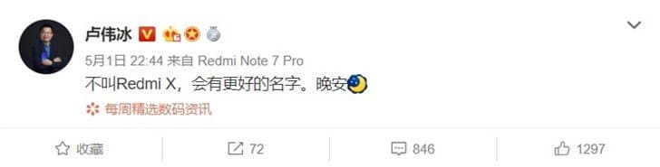 Лю Вейбинг (Lu Weibing) эту утечку не подтвердил. Он сообщил, что именоваться смартфон будет иначе. Дословно он сказал следующее «[Флагман] называется не Redmi X, название будет лучше».
