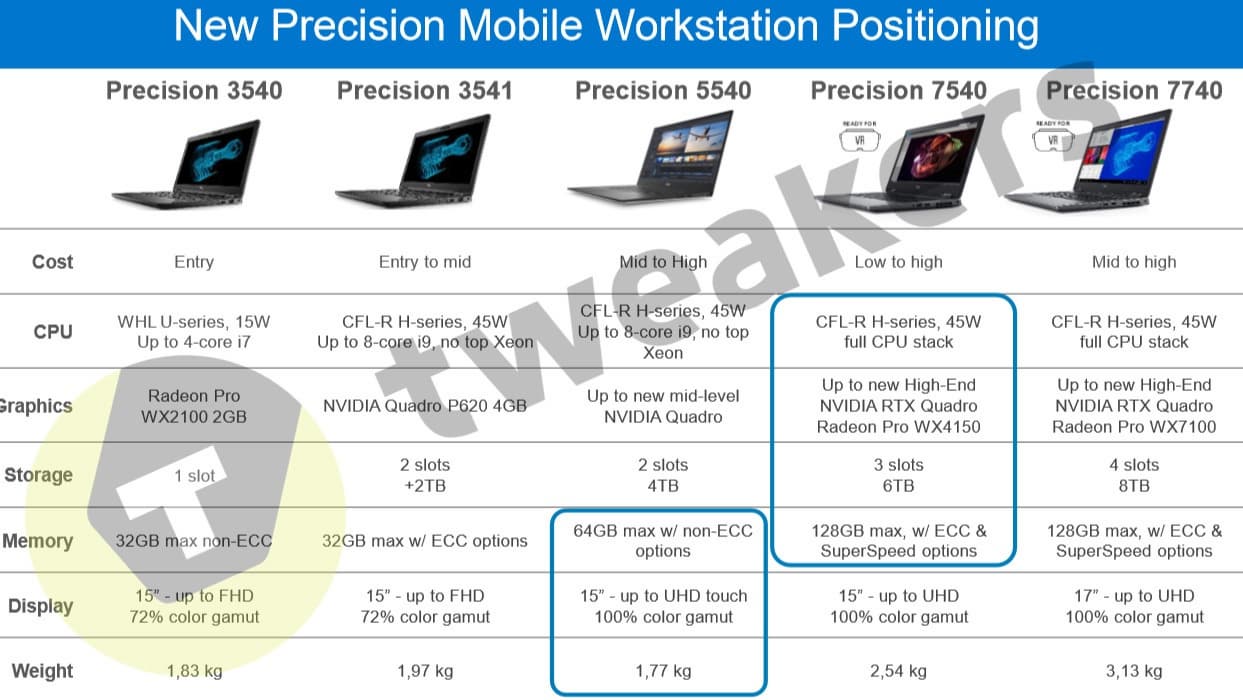 Как видно, Quadro RTX значится в составе двух мобильных рабочих станций – Precision 7540 и Precision 7740. Первая должна составить альтернативу видеокарте AMD Radeon Pro WX4150, которая является эквивалентом Radeon RX 460. Она могла бы быть построена на GPU TU106, который по своим параметрам заметно превосходит Polaris 11, используемый в WX 4150.