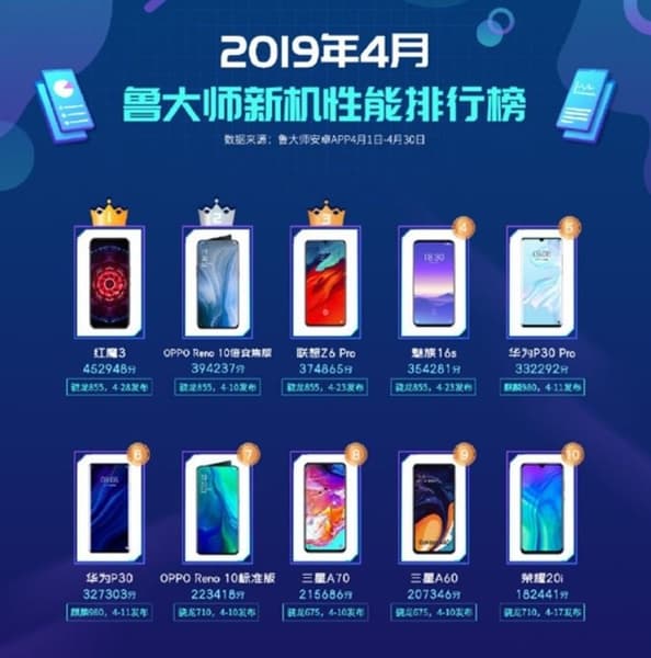 В рейтинге, как обычно, 10 моделей. На первой строчке с 452 948 баллами обосновался Nubia Red Magic 3, представленный в прошлое воскресенье. Серебряную корону получил еще один недавний новичок – Oppo Reno в топовом варианте, бронзу за собой закрепил Lenovo Z6 Pro. Всего в рейтинге три смартфона Huawei, по два Oppo и Samsung, по одному Lenovo, Meizu и Nubia.