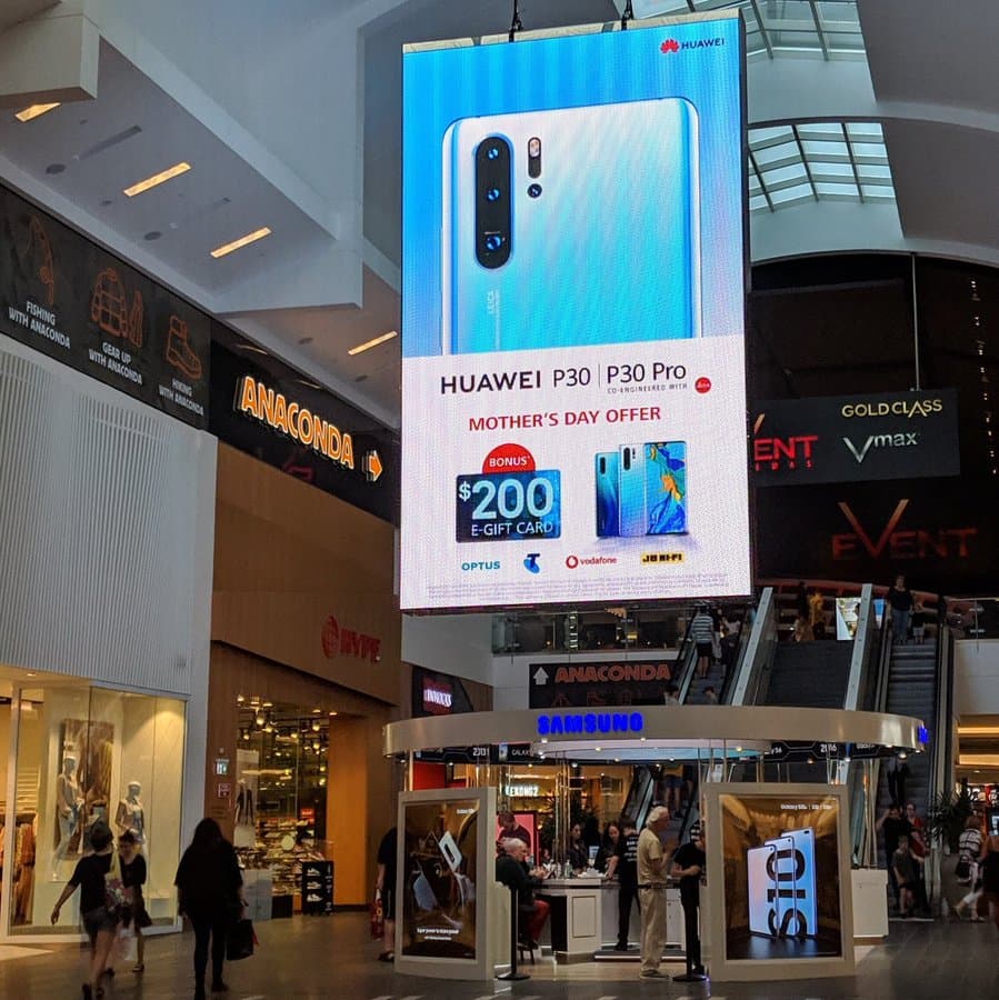 В борьбе за внимание пользователей используются самые разные способы. Так, например, в Брисбене над торговой точкой Samsung разместили большой плакат Huawei P30 и Huawei P30 Pro, который приковывает внимание гораздо сильнее, чем логотип Samsung и демонстрационная зона Galaxy S10.