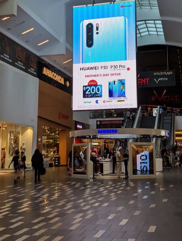 Как сообщает источник, Huawei решила весьма своеобразно прорекламировать свой флагманский смартфон P30 Pro, разместив огромный рекламный плакат прямо над небольшой фирменной торговой точкой Samsung в торговом центре в Брисбене.
