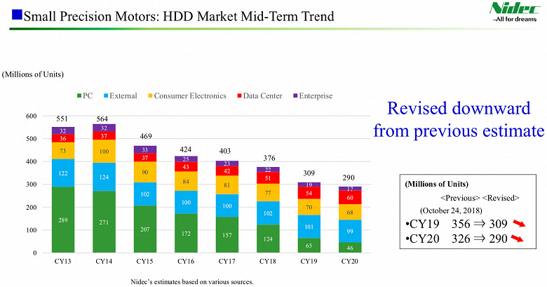 Основными потребителями HDD сейчас являются центры обработки данных, закупающие HDD объемом более 10 ТБ. Поскольку двигатели есть в каждом накопителе, поставки накопителей прямо определяются поставками двигателей. В 2010 году Nidec отгрузила почти 650 миллионов таких двигателей, тогда как в 2018 году объем поставок сократился до 375 миллионов штук. На текущий год в Nidec прогнозируют отгрузку всего 290 миллионов двигателей.