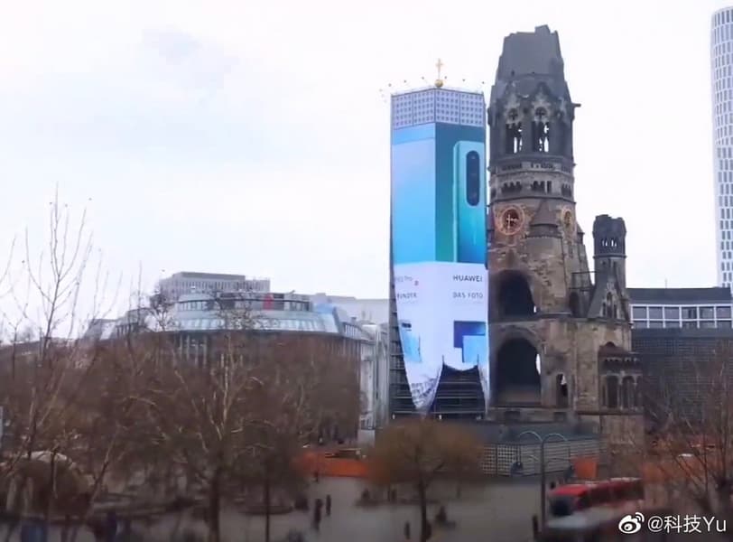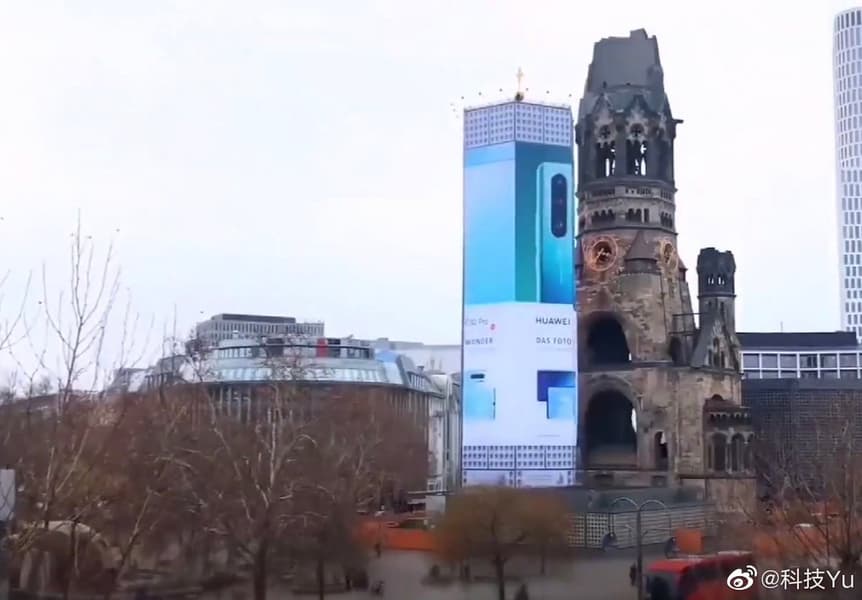 Обновлено: как выяснилось, это колокольня в Берлине часто используется для рекламы. Huawei никакого отношения к ее постройке не имеет.