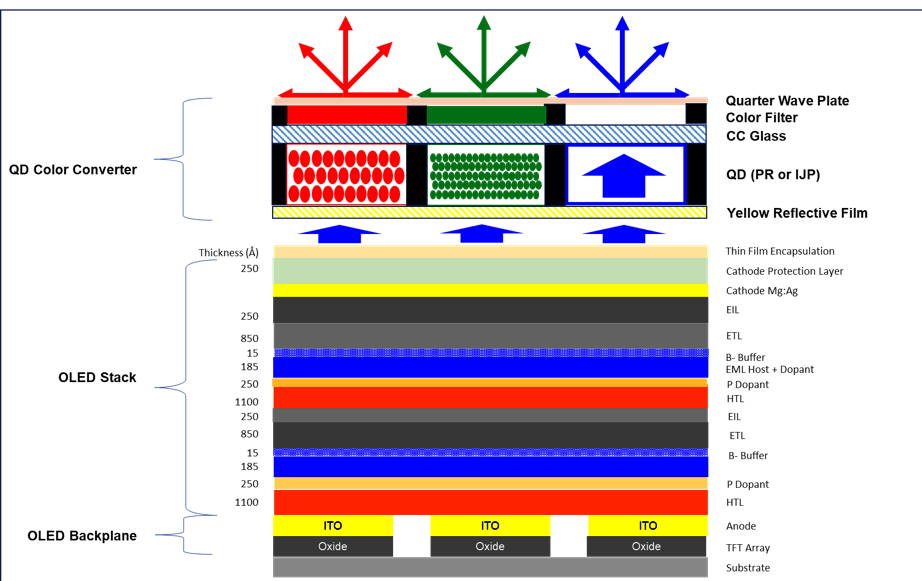 Компания Samsung Display, как известно, разрабатывает новую технологию телевизионных экранов, в которой эмиттеры OLED будут дополнены фотолюминесцентными материалами на основе квантовых точек. Эта технология получила обозначение QD-OLED.