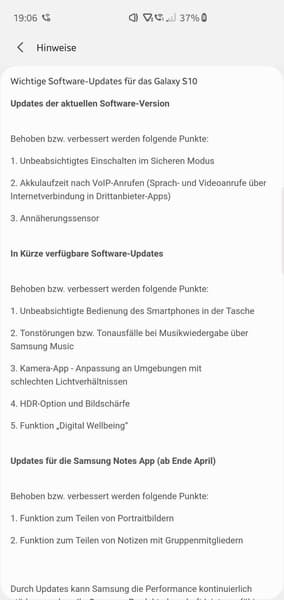 В будущим планируется решение проблем с неожиданными включениями смартфона в сумке или кармане, появлением странных шумов или пропадание звука при воспроизведении музыки через Samsung Music. Также в приложении камеры будет улучшена адаптация под окружение с плохим освещением, опция HDR и повышения резкости изображения. Кроме того, появится функция «Цифровое благополучие» (Digital Wellbeing).