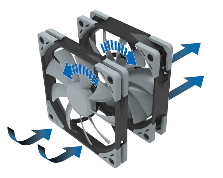 На радиаторе крепятся два вентилятора, скорость вращения которых регулируется с помощью ШИМ в диапазоне 300-1400 об/мин. Работу первого вентилятора сопровождает шум 2,7-23,9 дБА, второго — 4,0-24,9 дБА. С двумя вентиляторами конструкция весит 1000 г, а ее габариты равны 137 х 131 х 154,5 мм.