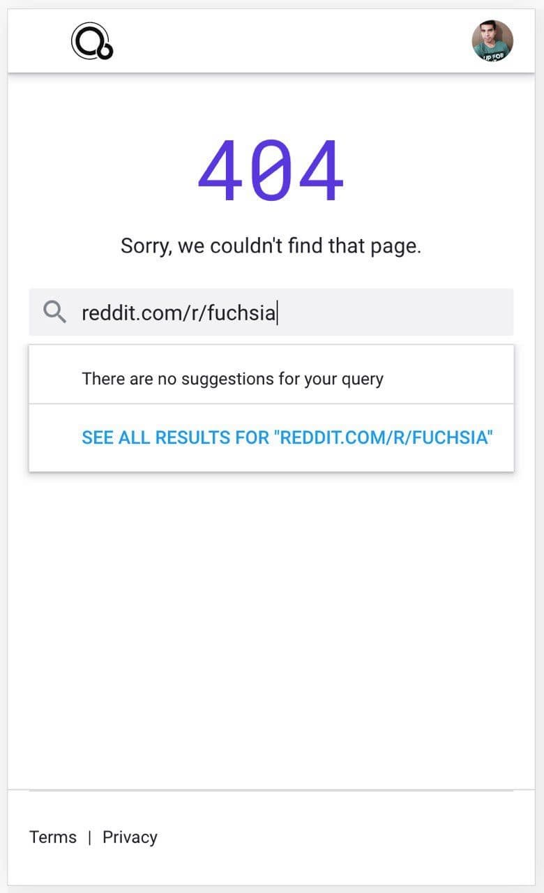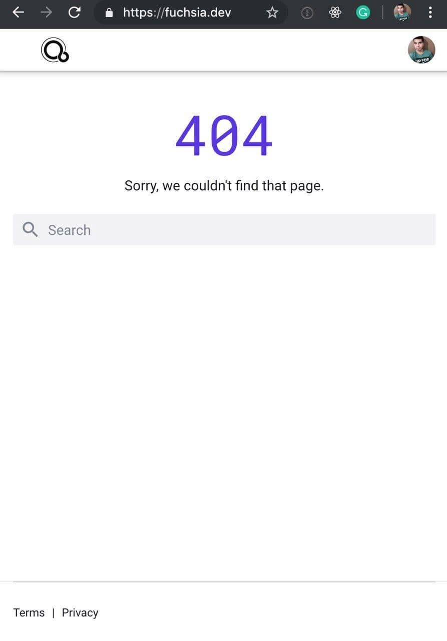 Хотя разработка явно в начальной стадии, основная функциональность уже работает. Так, Fuchsia.dev позволяет войти с помощью Google Account, также его можно установить как веб-приложение Progressive Web Apps, которое отображается на домашнем экране смартфона в виде чёрно-белого логотипа Fuchsia. Но один из ключевых аспектов у сайта отсутствует — у него нет собственной домашней страницы. Вместо этого пользователи перенаправляются на страницу 404 со строкой поиска.