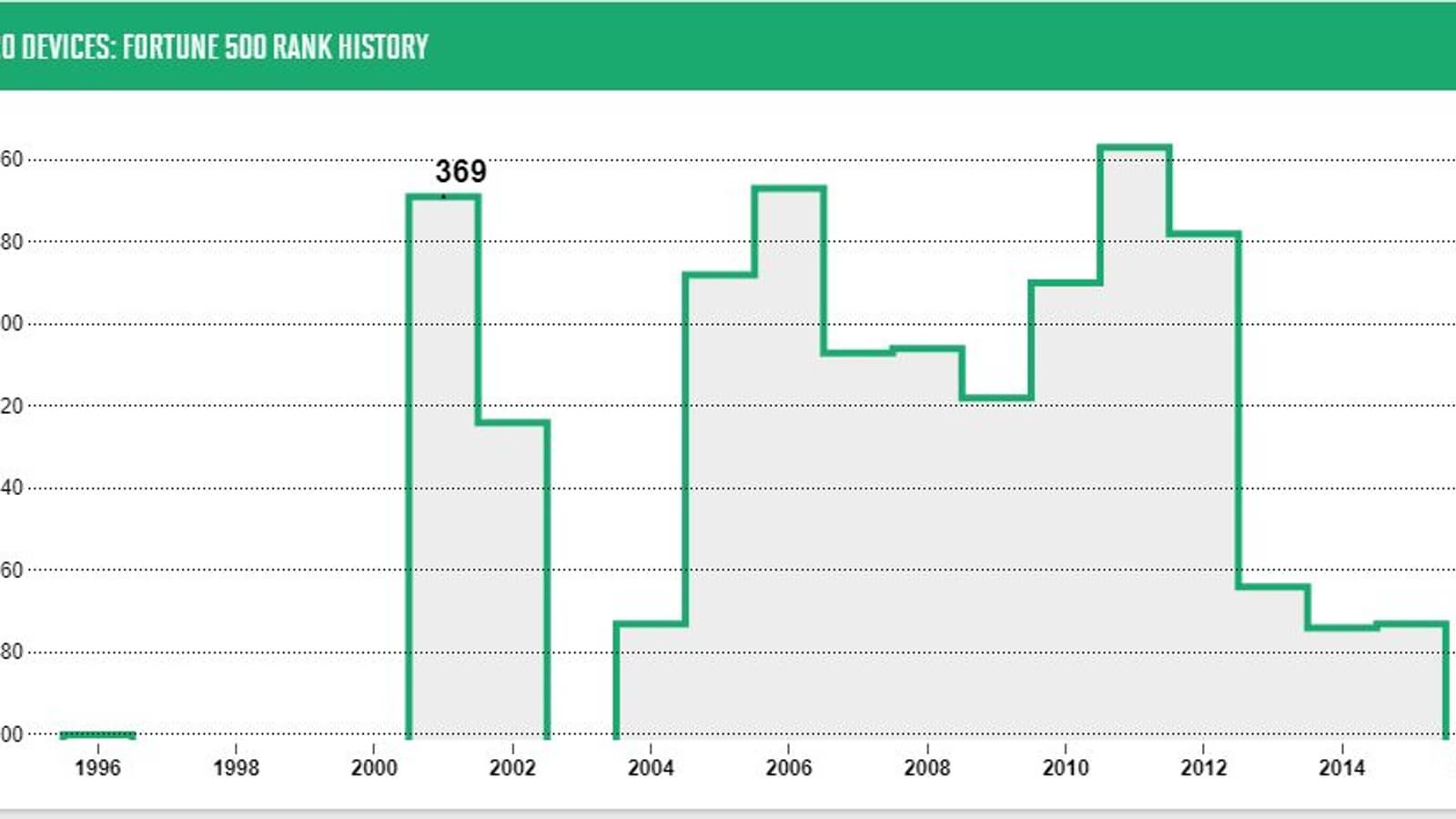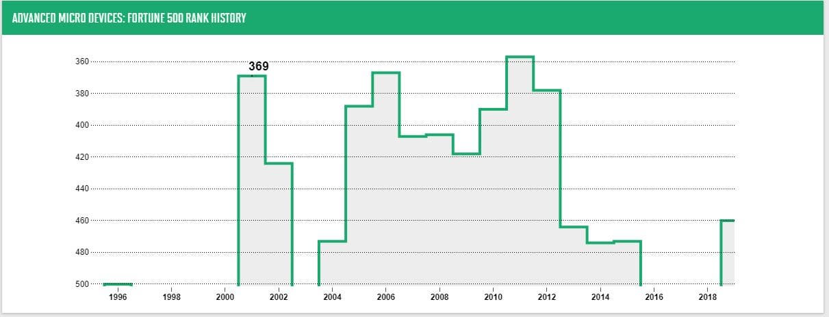 Компания AMD, которой в этом году исполняется 50 лет, 26 из них входила в список Fortune 500. В 2015 году она выбыла из рейтинга крупнейших мировых компаний по критерию годовой выручки, ежегодно составляемого журналом Fortune.