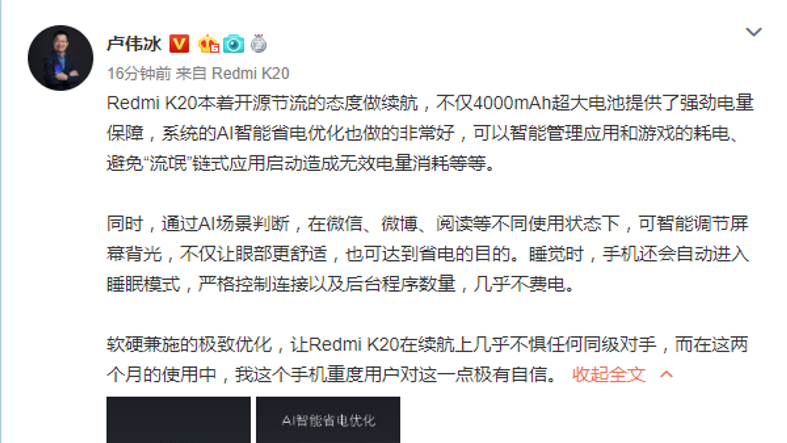 Слухи от том, что смартфон Redmi K20 получит аккумуляторную батарею емкостью 4000 мА·ч, подтвердились официально. Как сказал глава бренда Redmi Лю Вейбинг (Lu Weibing): «большая батарея — в ДНК продуктов Redmi». А потом топ-менеджер продолжил словами о том, что аккумуляторы емкостью 4000 мА·ч используются в смартфонах Redmi еще со времен выпуска Redmi Note 3, и Redmi K20 не будет выпадать из этой истории. Аккумулятора емкостью 4000 мА·ч хватит обычным пользователям на два, а активным — на полный рабочий день.