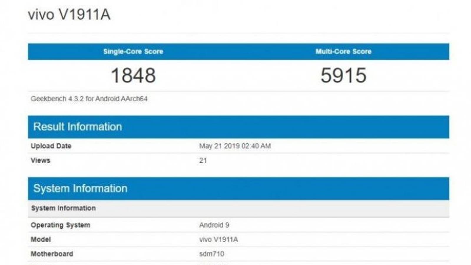 В базе данных популярного бенчмарка Geekbench появились результаты тестирования мобильного устройства Vivo V1911A, построенного на однокристальной системе Qualcomm Snapdragon 710.