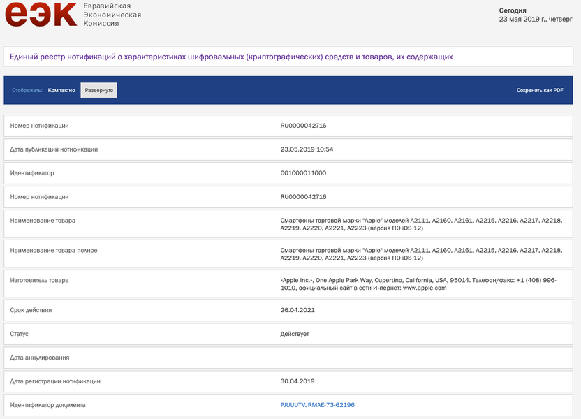 Ранее на сайте ЕЭК неоднократно находились подтверждения скорого выхода самых разных продуктов, в том числе и Apple — от многочисленных iPad и iPad Pro, до AirPods и MacBook Pro с тачбаром. Правда, характеристики на сайте ЕЭК не публикуются.