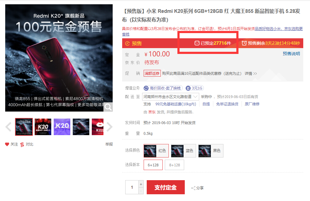 На крупнейшей торговой площадке Китая, JD.com, за полдня депозит за Redmi K20 внесло свыше 27 000 человек. Интересно будет посмотреть на итоговый объем предварительных заказов за четыре дня. Если текущая динамика сохранится, то он составит свыше 200 000.
