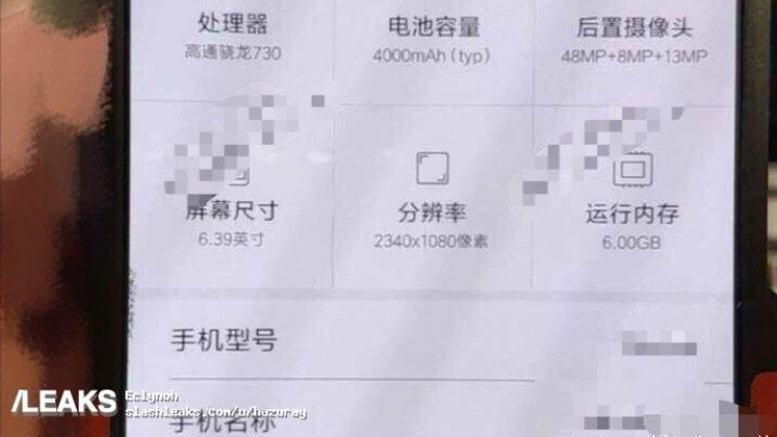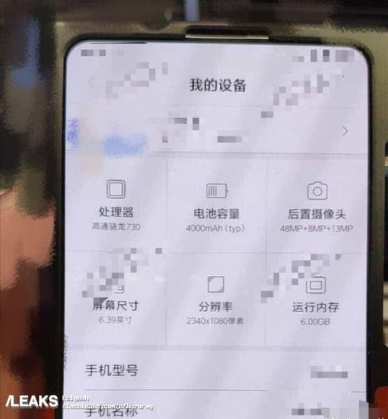 На фото видно, что смартфон построен на SoC Snapdragon 730. Диагональ экрана составляет 6,39 дюйма (при разрешении 2340 х 1080 пикселей), объем оперативной памяти — 6 ГБ, емкость аккумуляторной батареи — 4000 мА·ч. Это фото подтверждает разрешение датчиков тройной основной камеры — 8, 13 и 48 Мп.