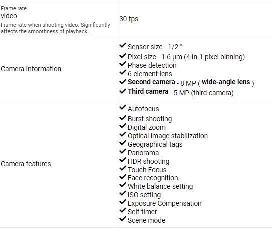 В основной камере три модуля. Основной представлен датчиком Sony IMX586 разрешением 48 Мп и объективом с диафрагмой F/1,7, во втором применяется датчик разрешением 8 Мп (он соединен с широкоугольным объективом), третий датчик – пятимегапиксельный. Пожалуй, самая главная особенность камеры этой модели – наличие оптической стабилизации. Фронтальная камера характеризуется разрешением 16 Мп и объективом с диафрагмой F/2,0.