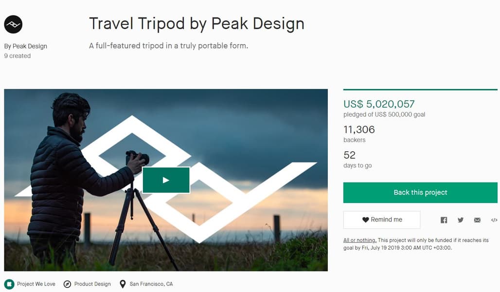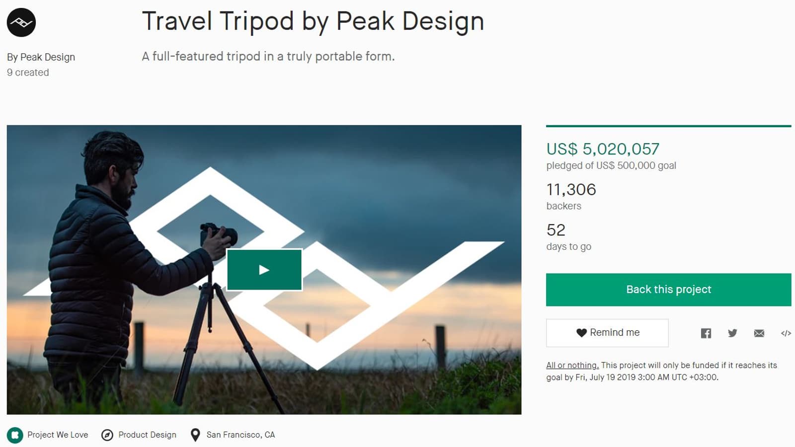 Казалось бы, на рынке полным-полно штативов на любой вкус и кошелек, однако создателям Travel Tripod, похоже, удалось убедить потенциальных покупателей в преимуществах своего детища. Рассчитывая собрать 500 000 долларов, авторы проекта уже смогли превысить эту цель в 10 раз. На момент написания эти строк сумма составляет 5 020 057 долларов.