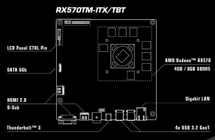Это плата размерами 170,2 х 170,2 мм. В основе лежит видеокарта Radeon RX 570, возможностей которой до сих пор достаточно для игр в Full HD. Объём памяти может быть равным как 4 ГБ, так и 8 ГБ.