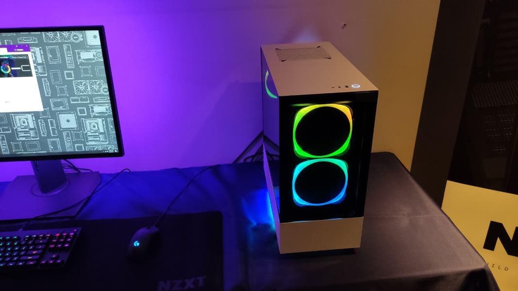 Изюминкой стенда NZXT стал корпус H510 Elite, оснащенный фронтальной стеклянной панелью и двумя вентиляторами диаметром 140 мм со встроенной подсветкой.
