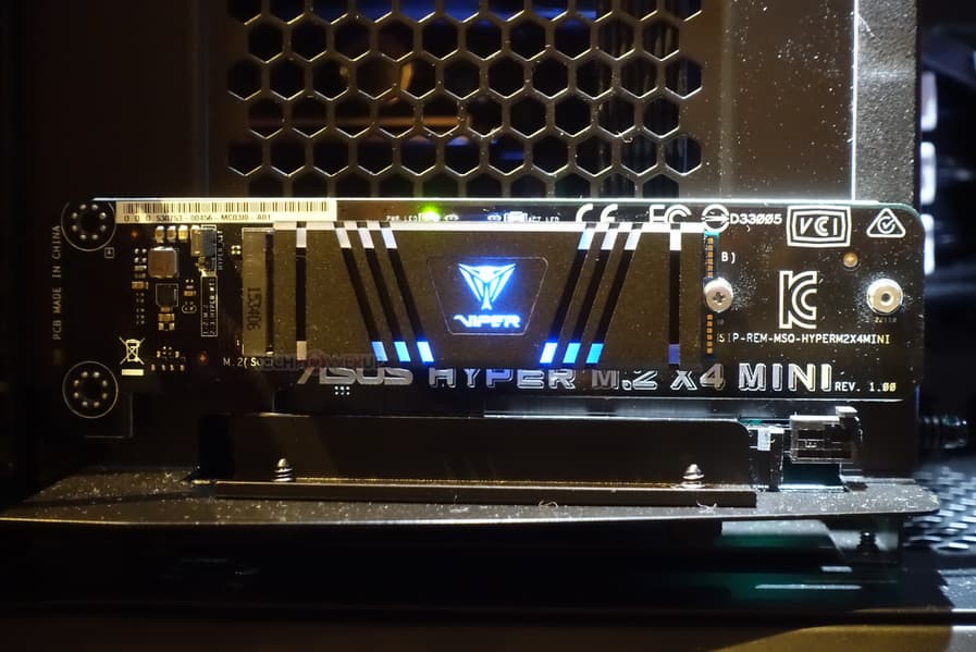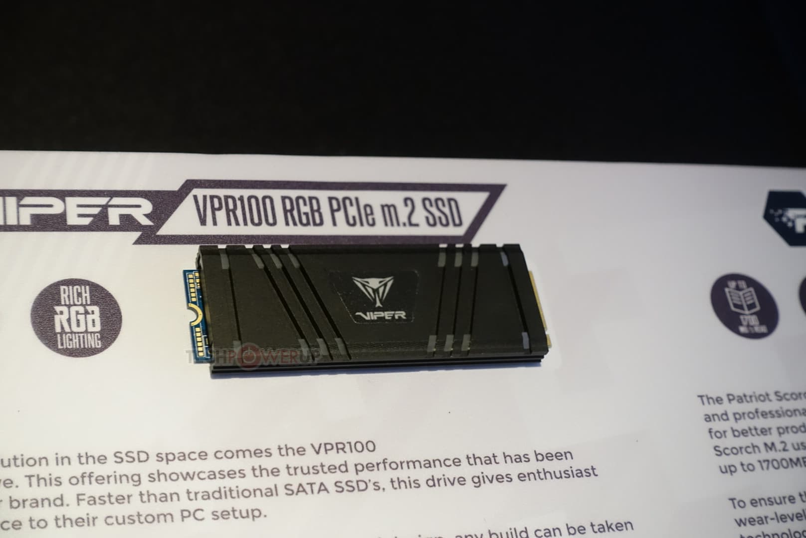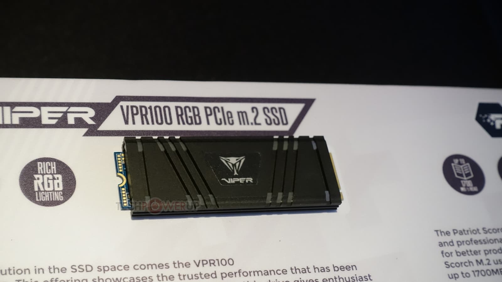 Модель Viper VPR100 имеет массивный радиатор, из-за которого она формально выходит за типоразмер M.2-2280. Это может быть проблемой при установке в некоторые слоты M.2, расположенные между двумя слотами PCIe. Радиатор большой, поскольку он украшен светодиодами RGB. Накопитель построен на контроллере Phison E12 и обеспечивает скорость последовательного чтения и записи до 3450 МБ/с и до 3000 МБ/с соответственно.