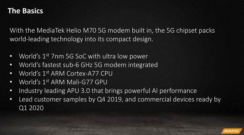 MediaTek 5G SoC является конвергентным решением, предлагающим в своем составе еще и встроенный модем Helio M70 5G (с поддержкой диапазонов ниже 6 ГГц). У Qualcomm нет пока ни одной SoC ни с интегрированной поддержкой 5G, но тем более с новыми ядрами Arm Cortex-A77. Именно поэтому MediaTek 5G SoC можно назвать самой передовой мобильной платформой в мире, но пока, увы, только на бумаге: товарные смартфоны на ее базе обещаны только в первом квартале следующего года.