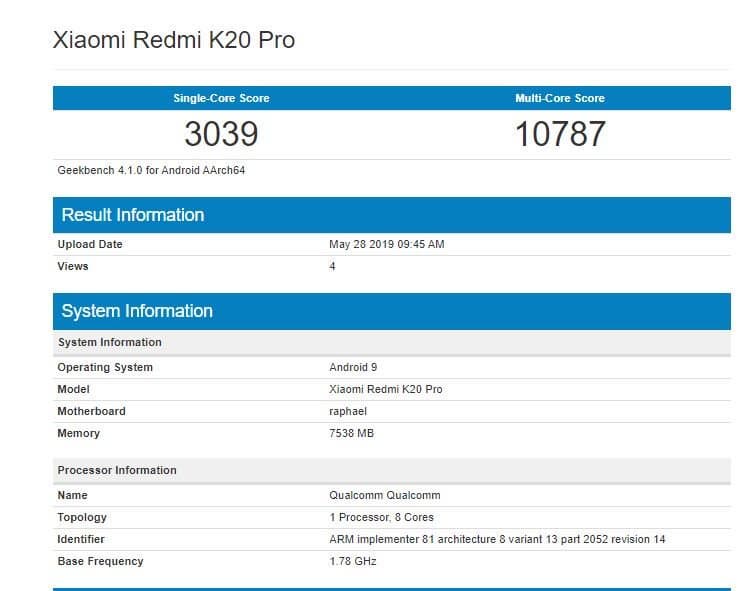 В базе данных популярного бенчмарка Geekbench, наконец, появились результаты тестирования анонсированного вчера смартфона Redmi K20 Pro, построенного на базе однокристальной системы Qualcomm Snapdragon 855.