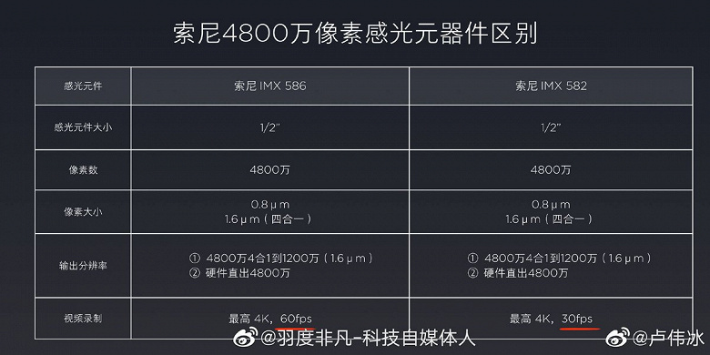 Однако при детальном изучении характеристик на официальном сайте всплыл еще один момент. Вместо Sony IMX586 младшая версия получила 48-мегапиксельный Sony IMX582 с таким же размером пикселей. Но если камера Redmi K20 Pro позволяет записывать видеоролики разрешением 4К при 60 к/с, то у Redmi K20 есть ограничение в 30 к/с.
