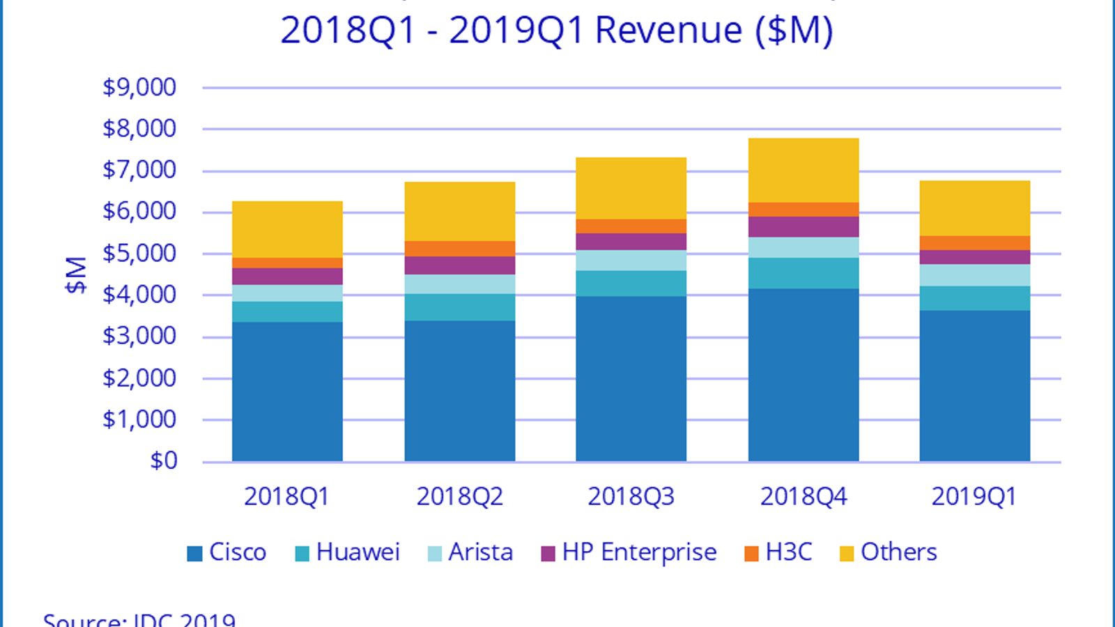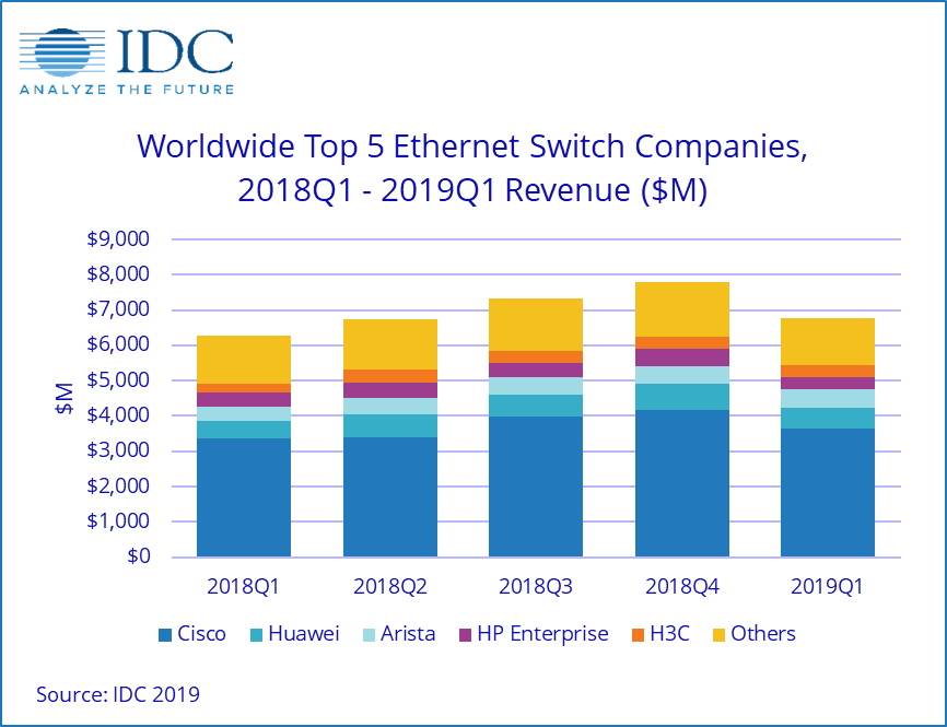 Специалисты аналитической компании IDC подвели итоги первого квартала 2019 года на рынке коммутаторов Ethernet (Layer 2/3) и маршрутизаторов корпоративного уровня. Согласно подсчетам аналитиков, продажи коммутаторов достигли 6,8 млрд долларов, что соответствует росту на 7,8% в годовом выражении. Продажи маршрутизаторов корпоративного уровня за год увеличились на 8,2%, до 3,6 млрд долларов.