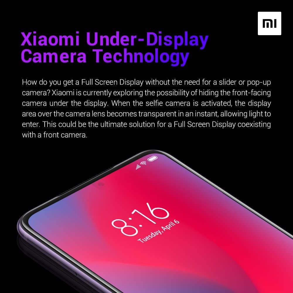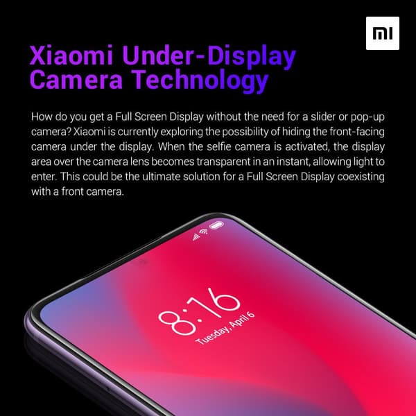 Технология была создана собственными силами Xiaomi. При включении 20-мегапиксельной фронтальной камеры, дисплей в верхней части становится прозрачным и одновременно начинает выполнять роль объектива для камеры.