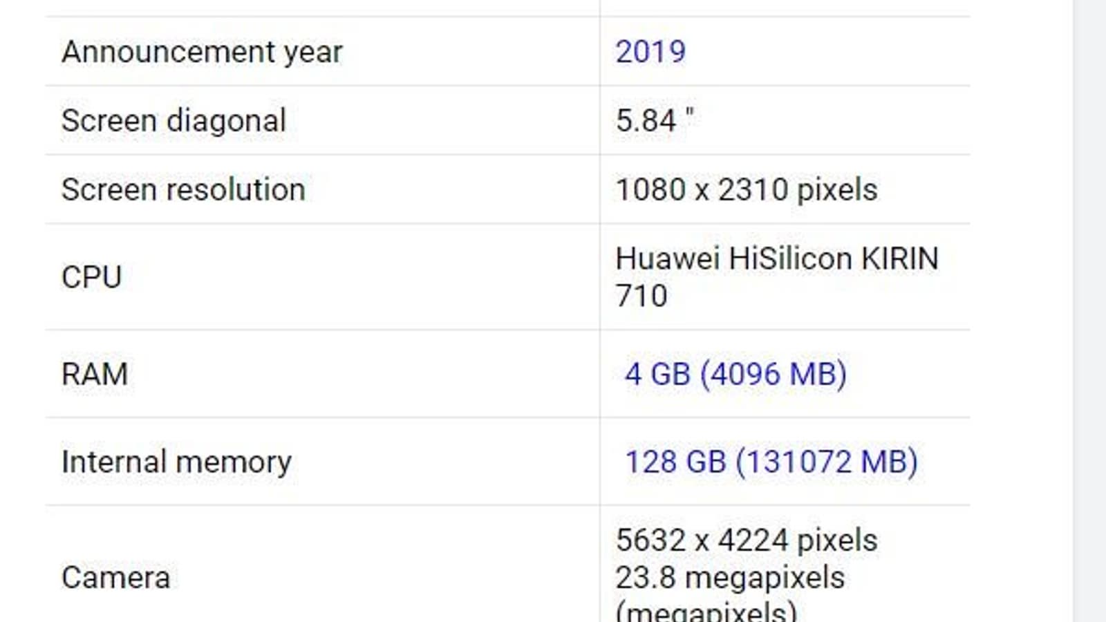 Как видно на картинках, Nova 5i построен на однокристальной платформе Kirin 710, имеет 4 ГБ оперативной и 128 ГБ встроенной флэш-памяти в виде модуля eMMC 5.1. Память можно расширить при помощи карт microSD, роль ОС выполняет Android 9.0 Pie.