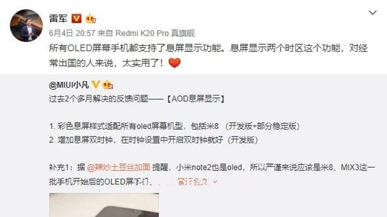 Вчера исполнительный директор Лэй Цзюнь (Lei Jun) оставил на своей страничке в социальной сети Weibo сообщение, которое касается функциональности всегда включенного экрана (Always On Display).