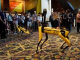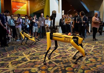 Робот-собака SpotMini компании Boston Dynamics поиграл с настоящей овчаркой и упал на презентации