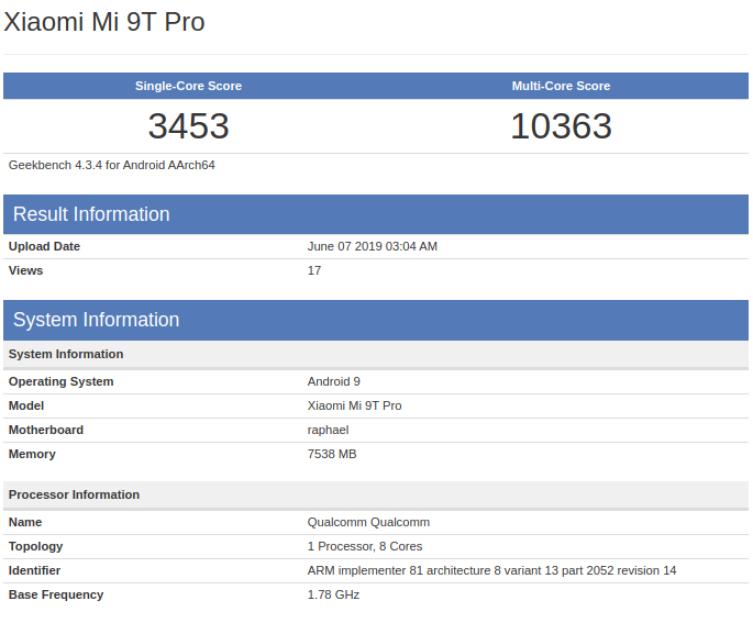 Xiaomi Mi 9T Pro проходит под кодовым названием Raphael, которое было и у Redmi K20. Объем оперативной памяти протестированного устройства составляет 8 ГБ.