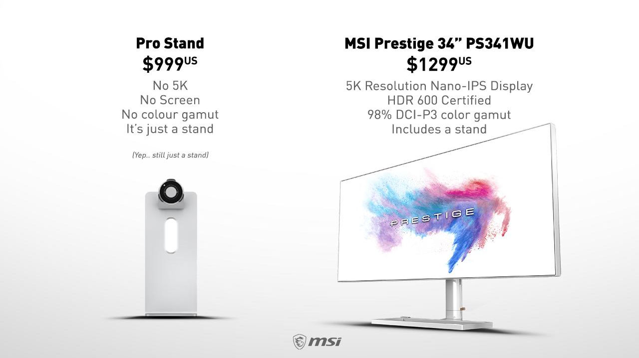 Apple наверняка еще долго будут припоминать и новый MacPro, напоминающий терку для сыра, и подставку для монитора ProStand, представляющую собой… обычную подставку ценой $1000. Но пока анонс еще свеж в памяти, маркетологи MSI решили потроллить американскую компанию.
