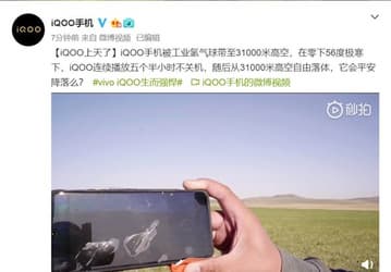 Смартфон Vivo iQOO подняли при помощи водородного аэростата на высоту 31 540 метров
