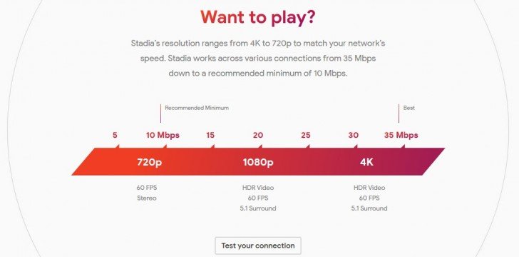 Google рекомендует скорость не менее 10 Мбит/с для потоковой передачи видео 720p при кадровой частоте 60 к/с и стереозвуке, не менее 20 Мбит/с — для HDR 1080p при 60 к/с и объемном звуке 5.1, не менее 30 Мбит/с — для HDR 4K при 60 к/с и звуке 5.1.