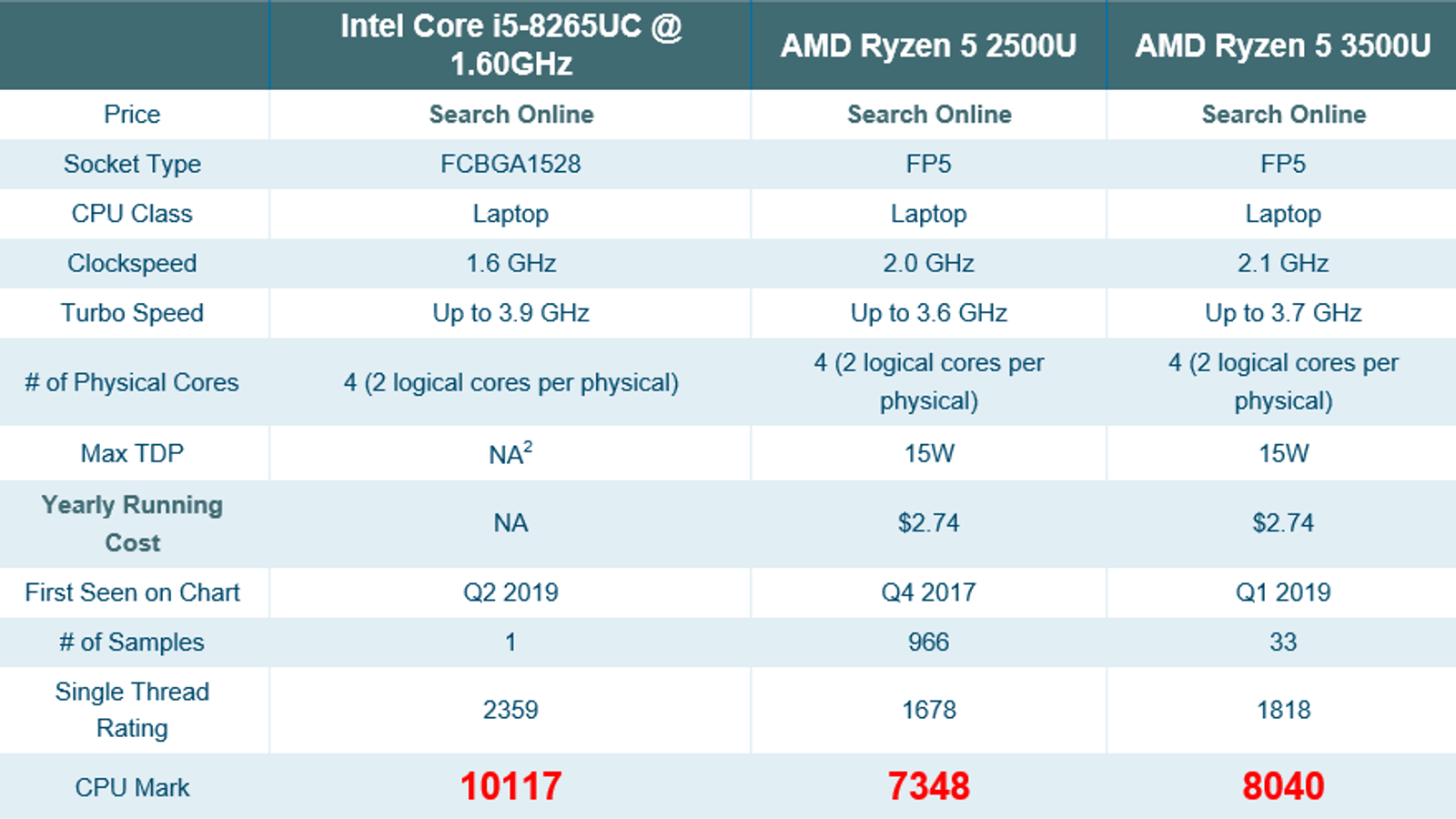 В бенчмарке PassMark Core i5-8265UC cо своими 10 117 баллами громит и Ryzen 5 2500U и Ryzen 5 3500U – у тех 7348 и 8040 баллов соответственно. При этом базовая частота Core i5-8265UC ниже, чем у процессоров AMD, хотя максимальная все-таки на 200-300 МГц выше.