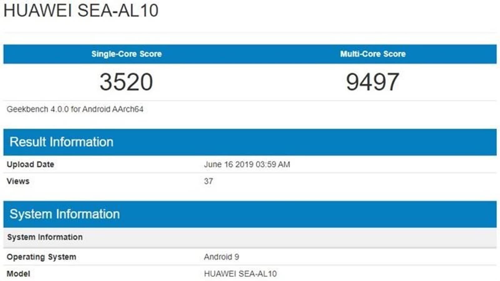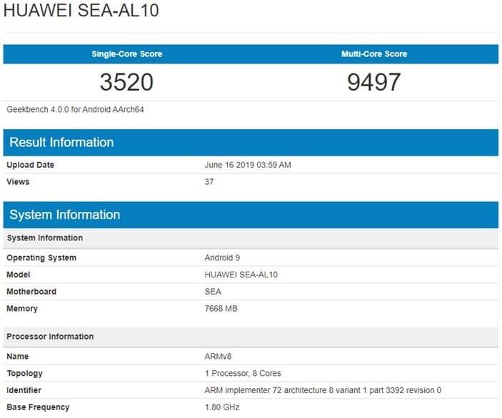 В базе данных бенчмарка Geekbench появился смартфон Huawei под обозначением SEA-AL10 — по данным китайского источника за этим каталожным номером скрывается модель Noa 5 Pro, топовая в серии Nova 5. Ее выпуск ожидается 21 июня одновременно с моделями Nova 5 и Nova 5i, но основные характеристики уже, можно сказать, подтверждены.