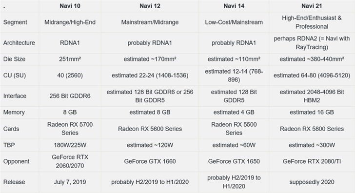 Предварительные характеристики Navi 12, Navi 14 и Navi 21 уже опубликованы. Судя по всему, Navi 12 выйдут под обозначением Radeon RX 5600 и будут конкурировать с Nvidia GeForce GTX 1660, Navi 14 с торговым названием Radeon RX 5500 выступят альтернативой Nvidia GeForce GTX 1650, ну а Radeon RX 5800 (Navi 21) придется бороться одновременно с Nvidia GeForce RTX 2080 и RTX 2080 Ti.